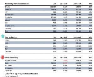 While the “large-cap” altcoins like Etheruem, XRP, and others from the top ten faired better than Bitcoin, and while last week’s best-performing assets were mid-cap altcoins, this week small-cap altcoins were the rising stars of the crypto market.