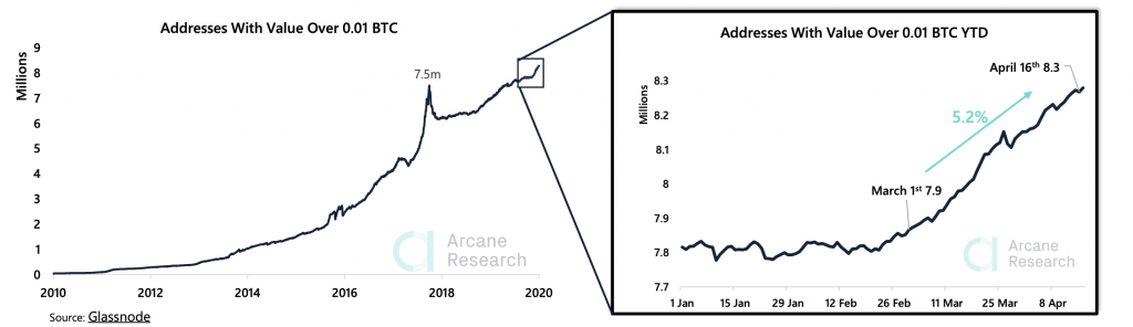 The number of blockchain wallet addresses with 0.01 BTC or higher in holdings has grown significantly over the last month. It’s not clear if this is due to the upcoming halving, low prices, or an expectation that fiat will soon fail, but whatever the reason, more and more people are hoarding Bitcoin.