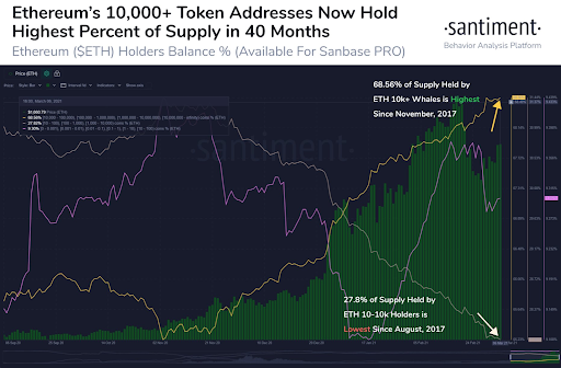 Currently, most of the supply of ETH is held by whales holding 10,000 ETH or more, with them accounting for 68.6% of the total supply of ETH. Ability to stake their ETH in DeFi projects or ETH2.0 could be a reason why large holdings of ETH are getting popular.